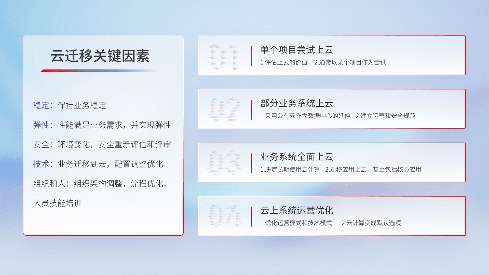 结合实际业务,,从规划设计、、云平台选型、、、云原生改造、、、、数据迁移、、、集成交付,,迁移全过程为客户识别最佳上云路径,,做好风险识别管理,,设计网络架构、、、身份权限、、、、安全审计合规、、、、操作审计、、日志审计、、、监控告警策略、、、多站点容灾设计等,,,,对云上基础设施进行整体规划,,,,提升IT治理水平,,以满足弹性、、、、高可用、、、高性能的需求。。。