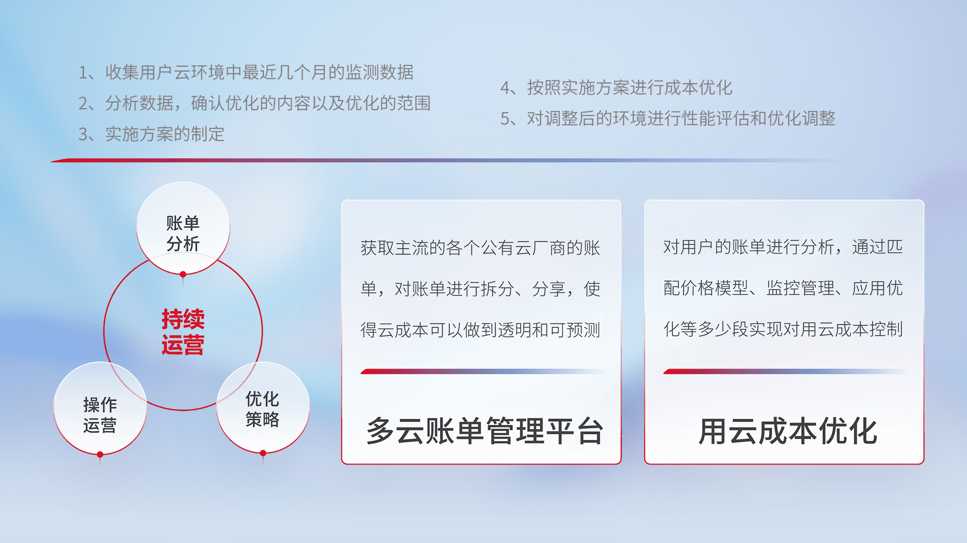 通过多云纳管,,,,以统一的资源数据模型把客户的云资源进行抽象和封装,,进而实现对多云资源的统一操作,,,保障云资源管理的可靠性、、、稳定性与可用性。。量身定制化运维内容,,,配置、、开发运维、、、补丁管理、、备份、、监控、、认证和访问管理、、审计和日常巡检等,,保障在用云过程中的可靠度,,稳定度以及高可用率。。。
